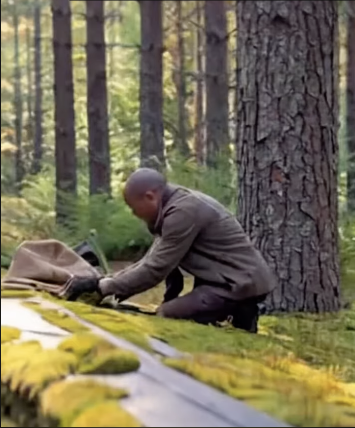 The images you see scattered through this post are AI-generated from my own face and vision. I fed the model my bald head, my build, my posture, and watched it return frames of me actually doing the work: gripping the rail on those stairs, staring up at raw concrete panels, shoveling dirt, pressing moss into place like I’m sealing the deal with the ground itself. They started as digital sketches. They’re becoming my blueprint.
